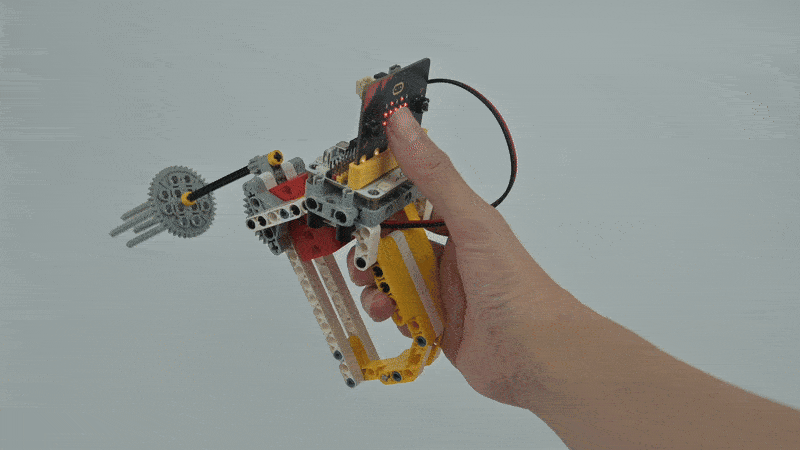 When the micro:bit is powering on, it displays a heart icon. When button A is pressed, the egg beater starts rotating, and when button B is pressed, it stops rotating.