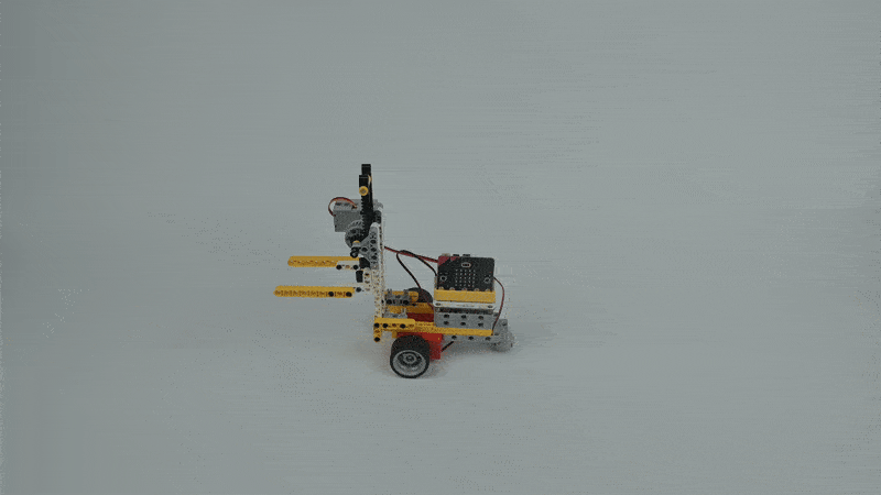 After turning it on, When you press button A on the micro:bit, the forklift moves forward; When you press button B on the micro:bit, the forklift moves backward; When you press buttons A+B on the micro:bit, the forklift stops; When you press the logo on the micro:bit, the forklift is raised; When you release the logo on the micro:bit, the forklift is lowered.