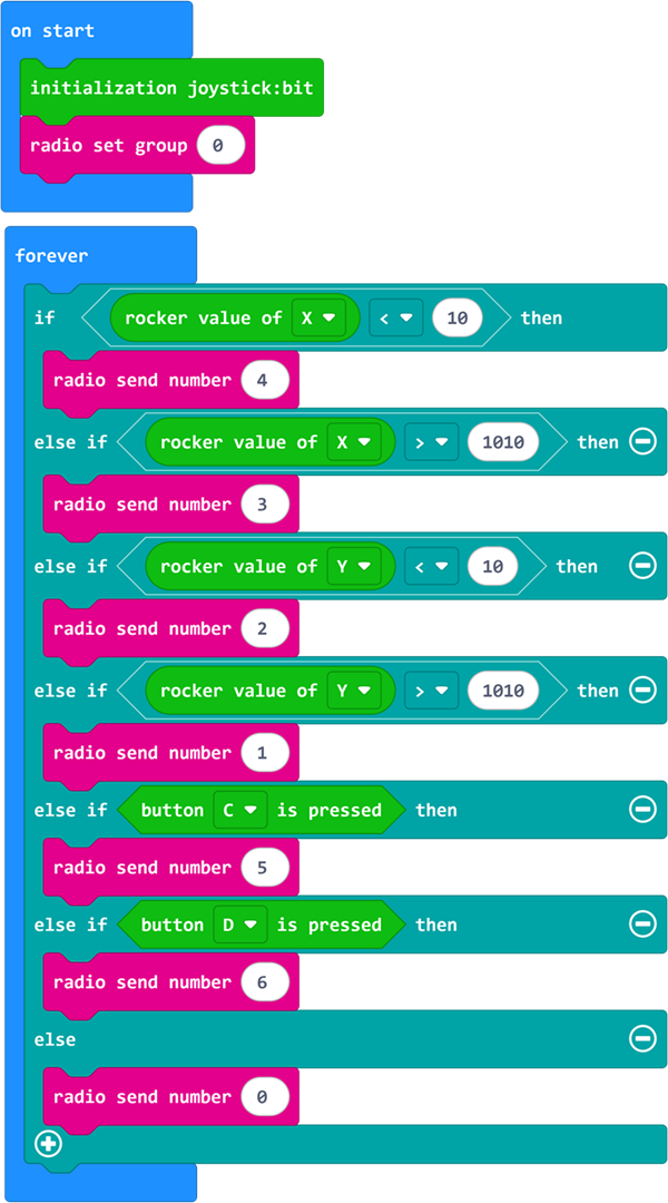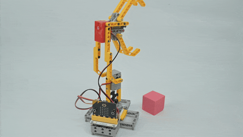 Control the robot arm with the Joystick:bit, the left and right direction of the handle rocker controls the rotation of the robot arm to the left and right, the up and down direction of the handle rocker controls the rise and fall of the robot arm, the C button controls the clamping of the robot arm, and the D button controls the release of the robot arm clamp.
