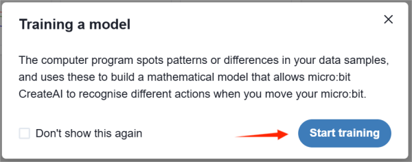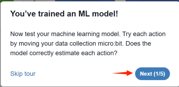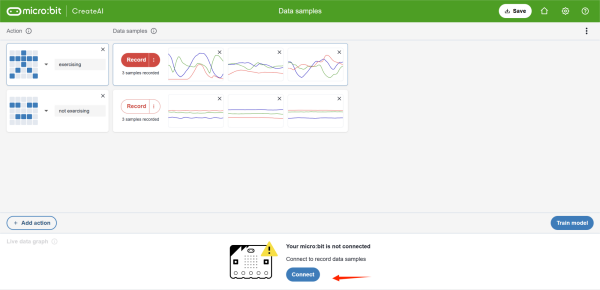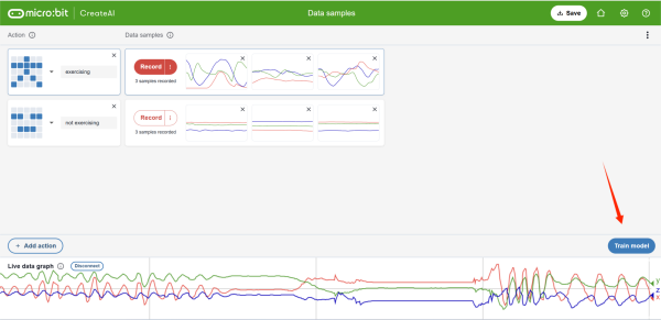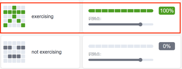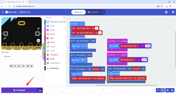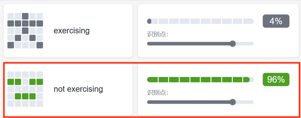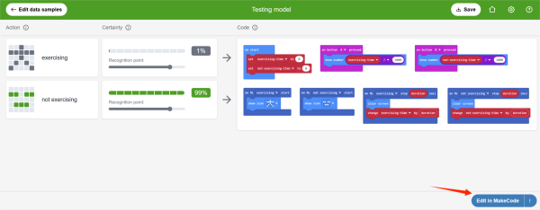 By comparing the trained data model and downloading it to the micro:bit board, pressing button "A" on the micro:bit board allows you to check how many seconds you have been exercising; pressing button "B" allows you to check the time you have been stationary.