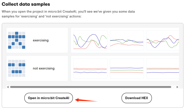 - Browse and read the relevant knowledge points, then locate the "Collect data samples" directory and click "Open in micro:bit CreateAI".