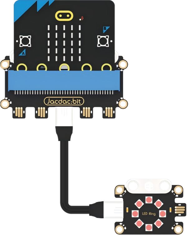 As shown in the figure below, insert the micro:bit into the Jacdac expansion board and use the connecting wire to connect the light ring to the gold finger interface of the Jacdac expansion board.