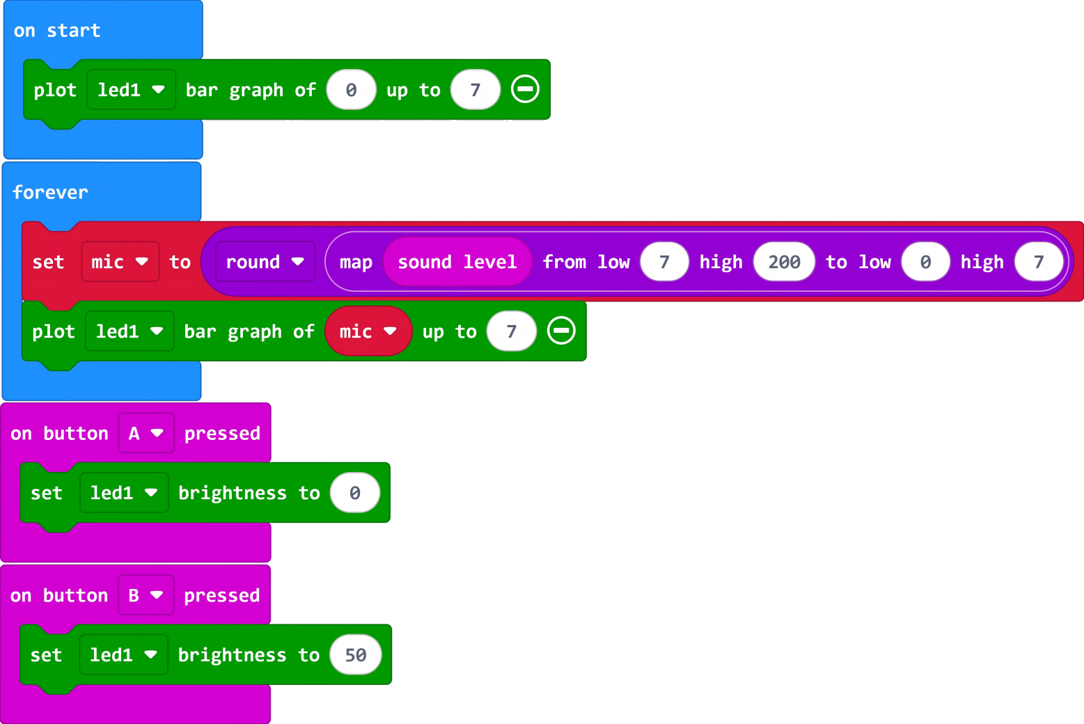 The microphone of micro:bit detects the ambient sound volume, and the LED light of the light ring will jump in a circle according to the volume of the sound. Press button A on the micro:bit to turn on the LED light, and press button B on the motherboard to turn off the LED light.
