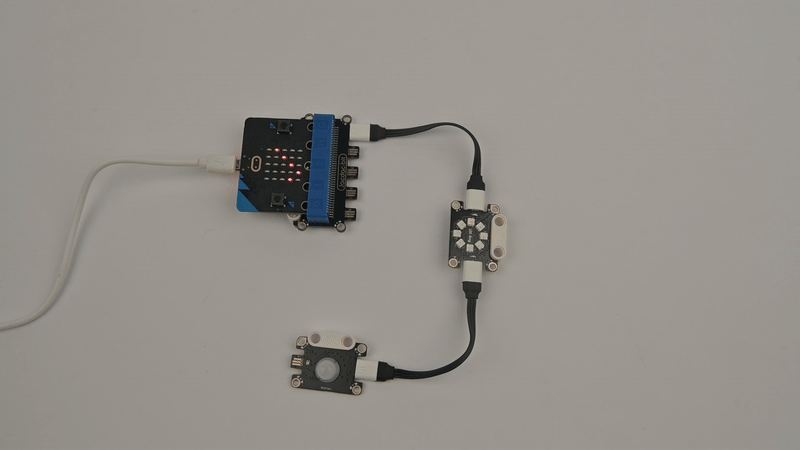 As shown in the figure below, insert the micro:bit into the Jacdac expansion board, and use the connecting wire to connect the human infrared sensor and the light ring to the gold finger interface of the Jacdac expansion board in a star shape.