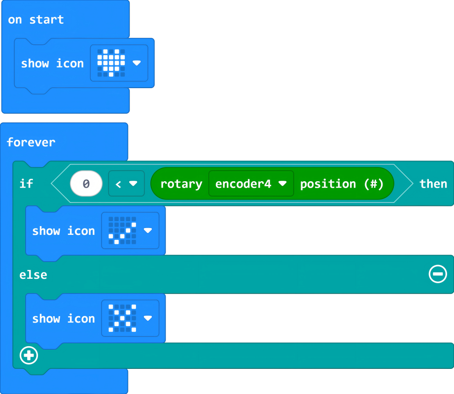 When the rotation angle of the rotary encoder is > 0, the micro:bit displays "√"; otherwise, it displays "×".