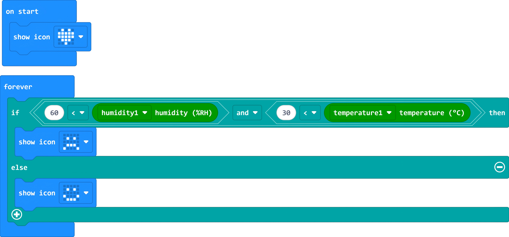 When the detected ambient temperature is > 30°C and humidity is > 60%, the micro:bit displays a "smiley face"; otherwise, it displays a "crying face".