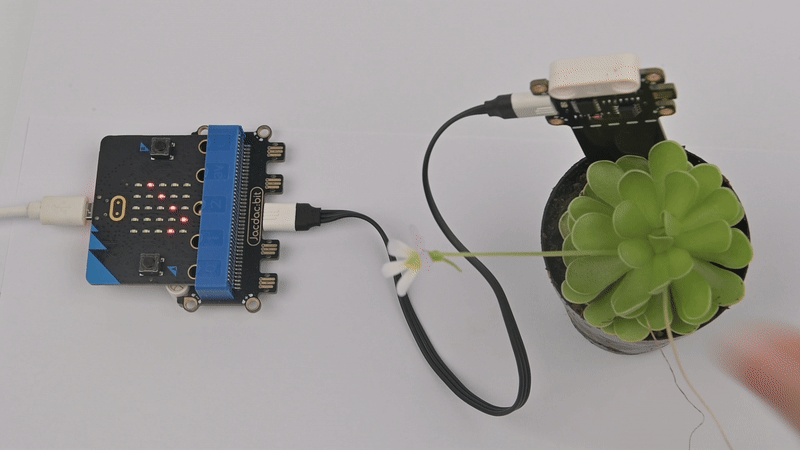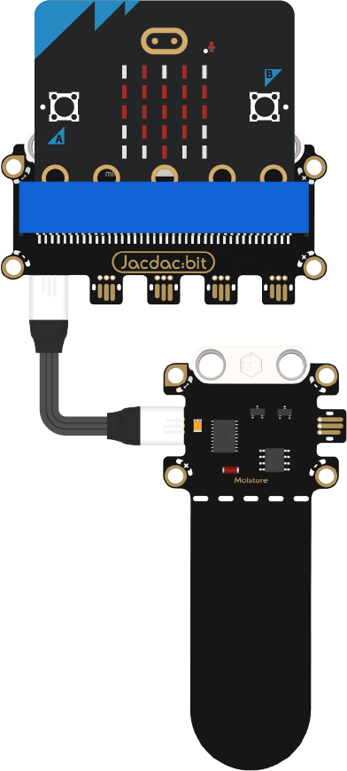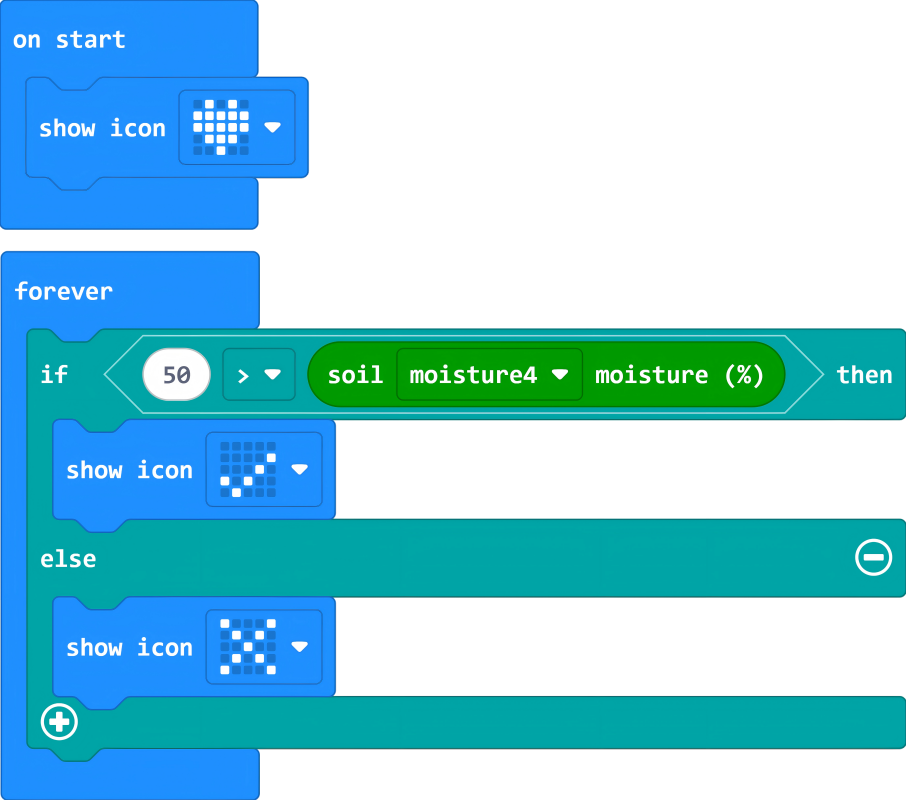 If the soil moisture sensor reading is <50%, the micro:bit displays "√"; otherwise, it displays "×".