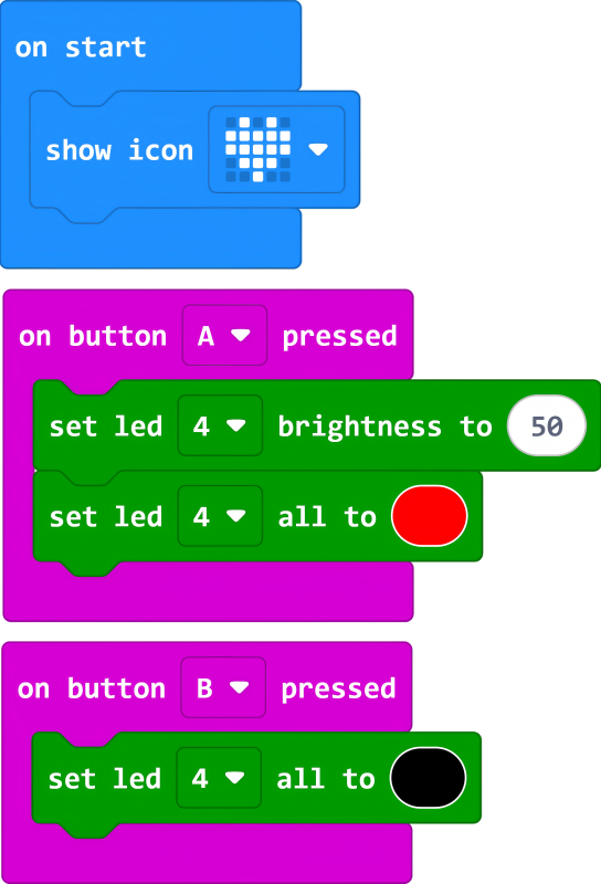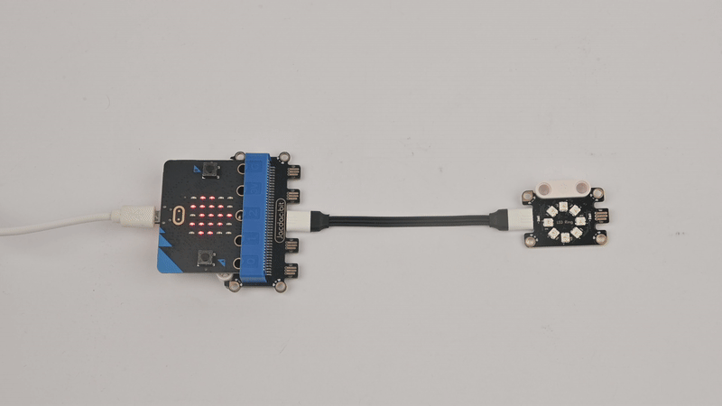 Press the A button on the micro:bit, and the LED ring lights up red; press the B button, and the LED ring turns off.
