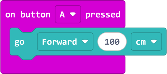 Drag a block called "Move forward 0 cm" from the block drawer and put it into "When button A is pressed", and change parameter 0 to 100.