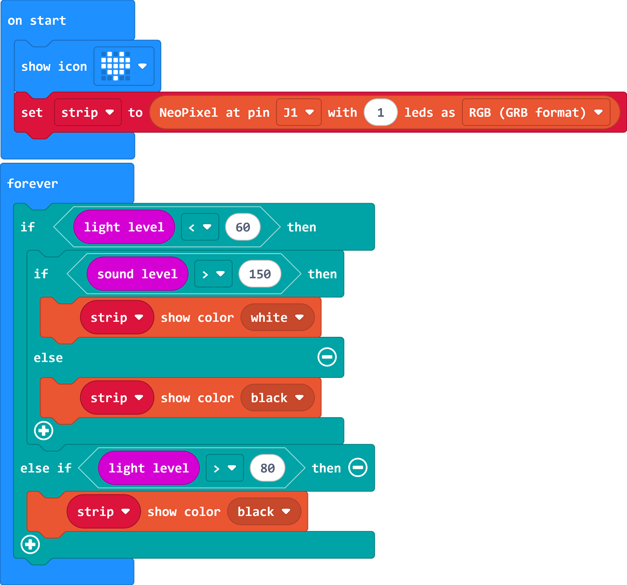 This project uses a micro:bit board, leveraging its onboard noise detection module and light sensor, combined with an external RGB LED light, to achieve intelligent response to both ambient light and sound. When it detects insufficient light and noise exceeding a threshold, the RGB light automatically turns on; when the environment returns to quiet or light is sufficient, the light automatically turns off. It is suitable for smart home, creative interactive installations, and other scenarios.