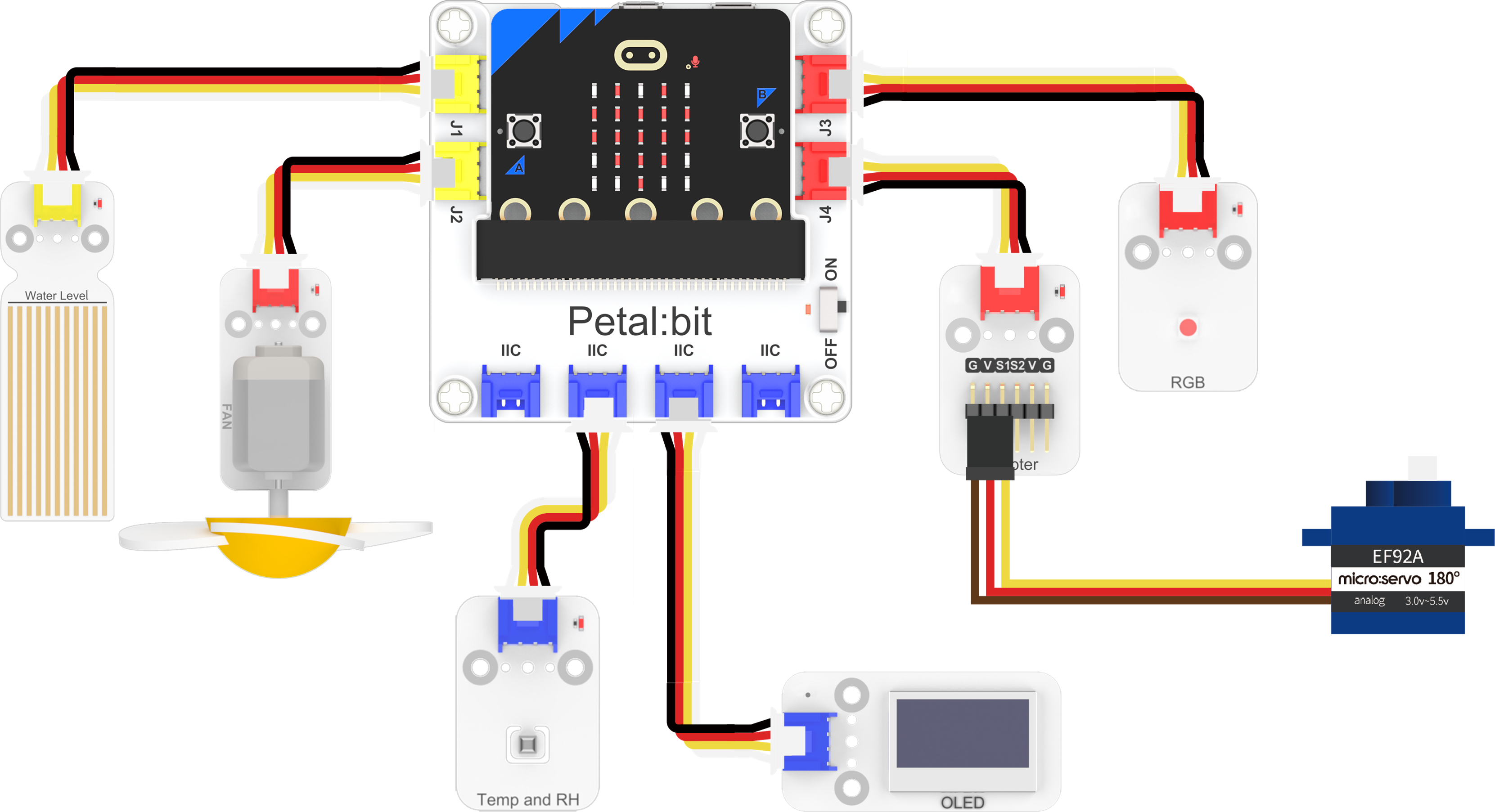 - Connect the temperature-humidity sensor and OLED display to the IIC interface of the Petal Base Expansion Board.
