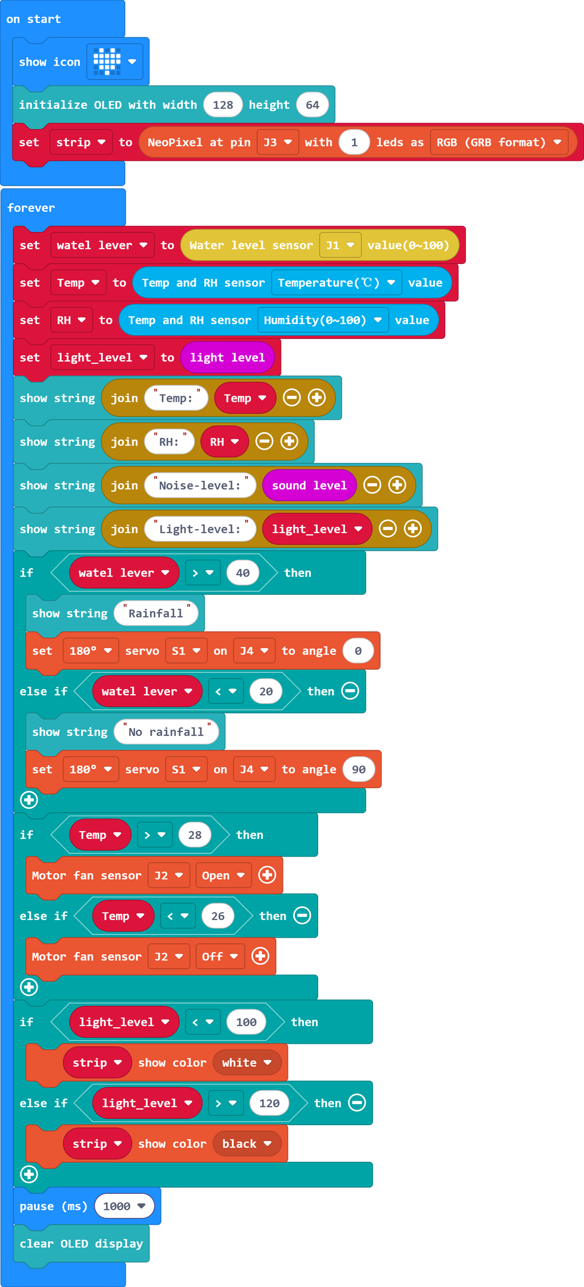 - Living Environment Detection: The OLED display shows real-time temperature, humidity, noise, light intensity, and whether it is raining.