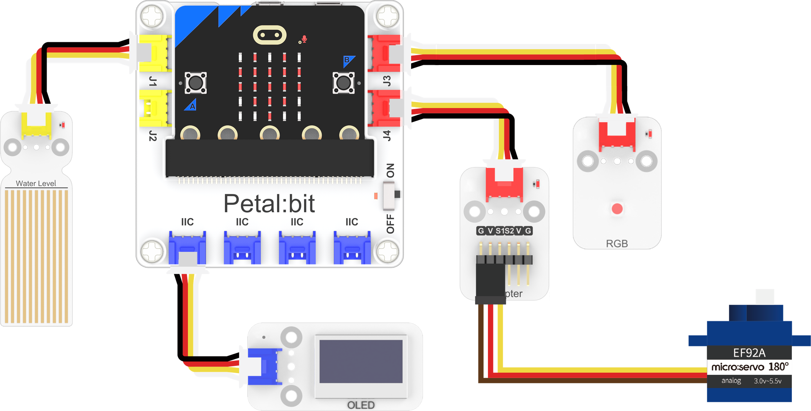 - Connect the water level sensor to the J1 interface of the Petal Base Expansion Board.
