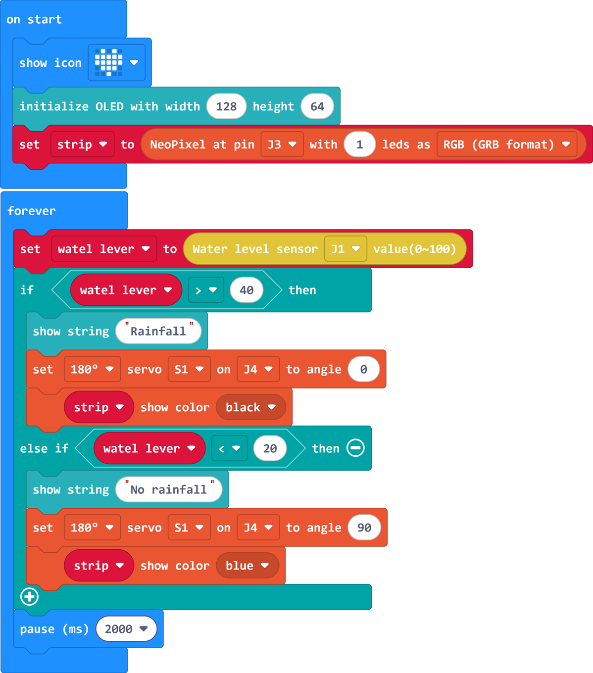 In this lesson, we will make a rain sensing window that automatically closes when it rains. The rain sensing window detects the accumulation of rainwater on the windowsill through a water level sensor. When rain is detected, it automatically drives a servo motor to raise the window sill baffle to prevent rainwater from splashing into the room. At the same time, the OLED display shows "Rainy Mode", and the rainbow light presents a blue breathing light effect, providing intelligent protection for home life.