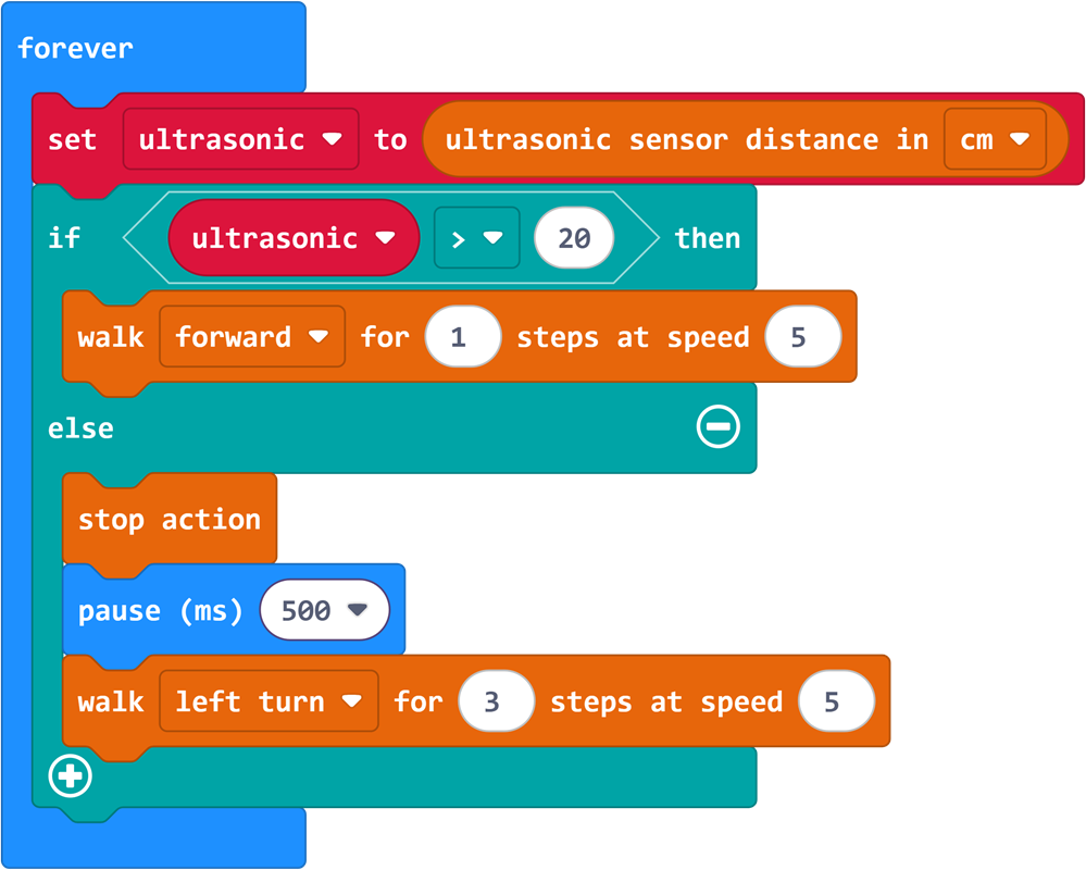 • 演示将"超声波检测值 < 10"作为条件,分别设置"那么"分支(停止+转弯)与"否则"分支(继续前进)的积木块组合。