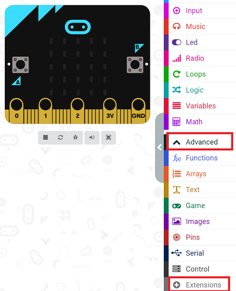 Click “Advanced“ in the MakeCode drawer and click “Extentions“ to see more choices.