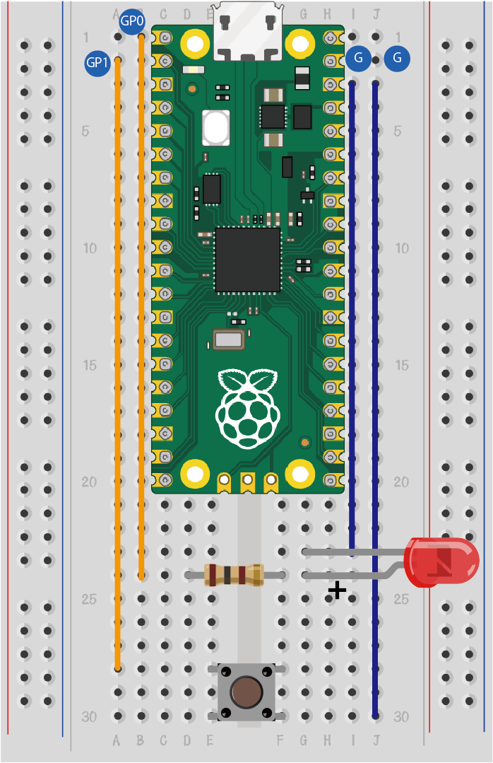 - Connect the long lead of the LED to pins GP0 and GP1 through resistors
