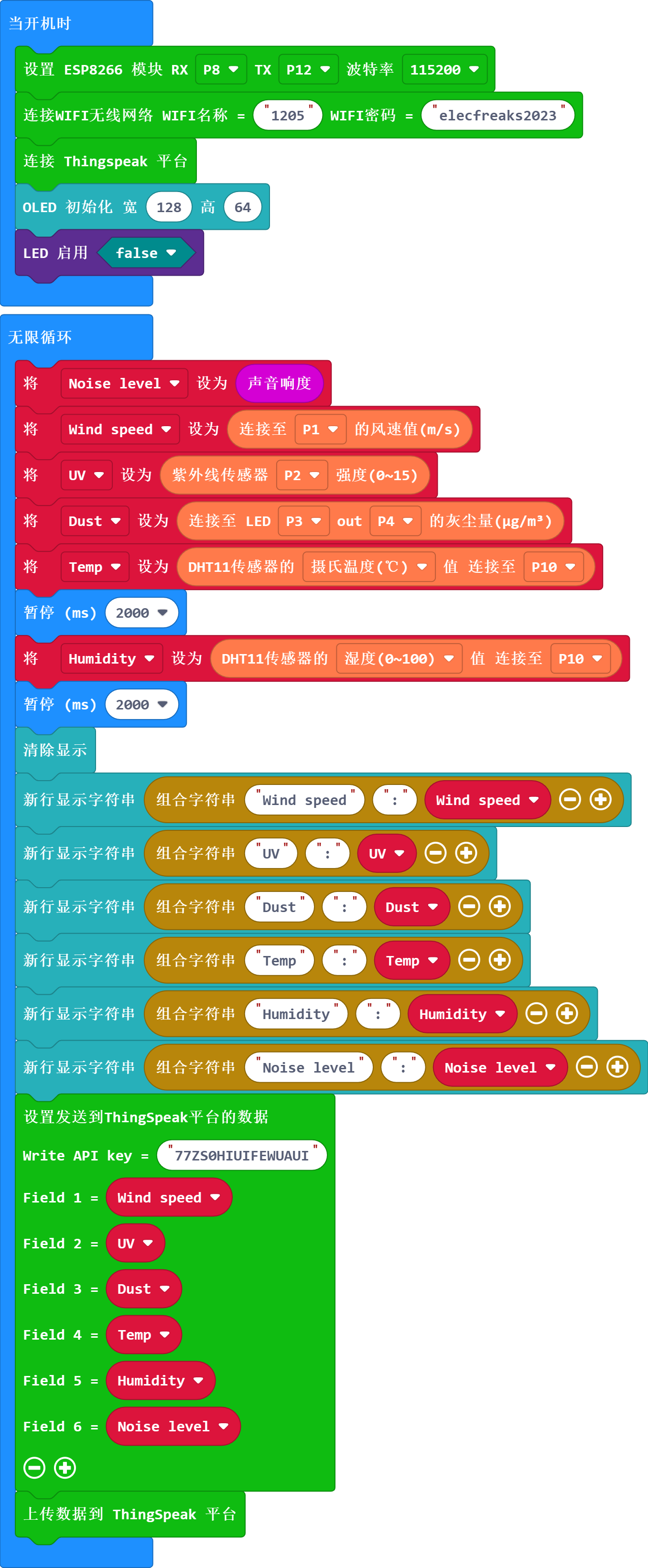 风速传感器连接到P1接口,紫外线传感器连接到P2接口,灰尘传感器的LED连接到P3接口,out连接到P4接口,DHT11温湿度传感器连接到P10接口,并将OLED显示屏安装在IoT:bit上。